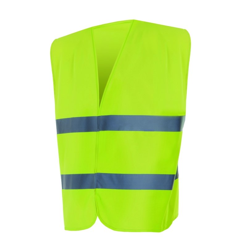 Chaleco de alta visibilidad con cintas reflectantes en el torso y cremallera central. Malla. 100% poliéster.